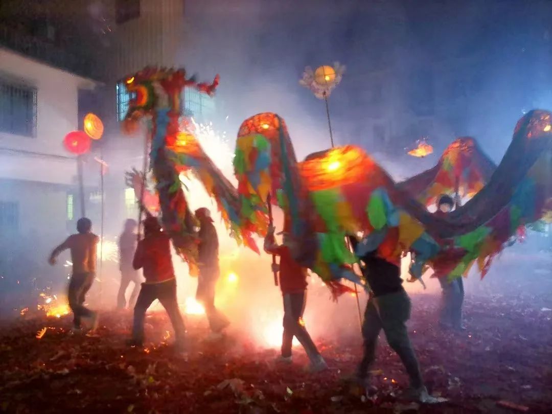 当晚,一群身穿红衣的小伙子托举着五彩斑斓的龙身,在节奏鲜明的锣鼓声中绕场游行。围观群众纷纷点燃鞭炮,将闪着“火”光的鞭炮抛向快速游动的“彩龙”队伍。刹那间,飞火点点,焰染龙体,场面蔚为壮观。